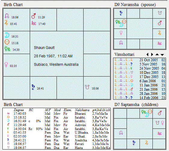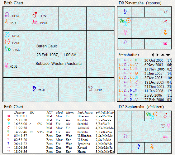 In Sarah's natal chart (above) we see sookshmantar lord Mercury, tightly conjunct 5th lord Sun in 11th house of "Gains". Mercury occupies nakshatra of antardasa lord Rahu who in turn occupies nakshatra of sookshmantar lord Mercury