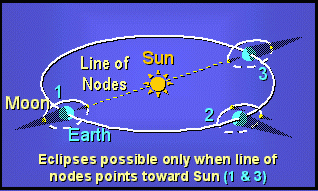 Solar and lunar eclipses can only occur when the Moon is near (±18°) one of the two points where the Moon's and Earth's orbits cross (called nodes). This allows the Moon to pass at least partially in front of the Sun (a solar eclipse), or at least partially move into the Earth's shadow (a lunar eclipse). That is, for eclipses to occur the Moon must be at New or Full Phase and the line of nodes must point toward Sun (as in points 1 or 3 below). Otherwise the Moon will not lie in the plane of the Earth's orbit and eclipses will not be possible (such as point 2).